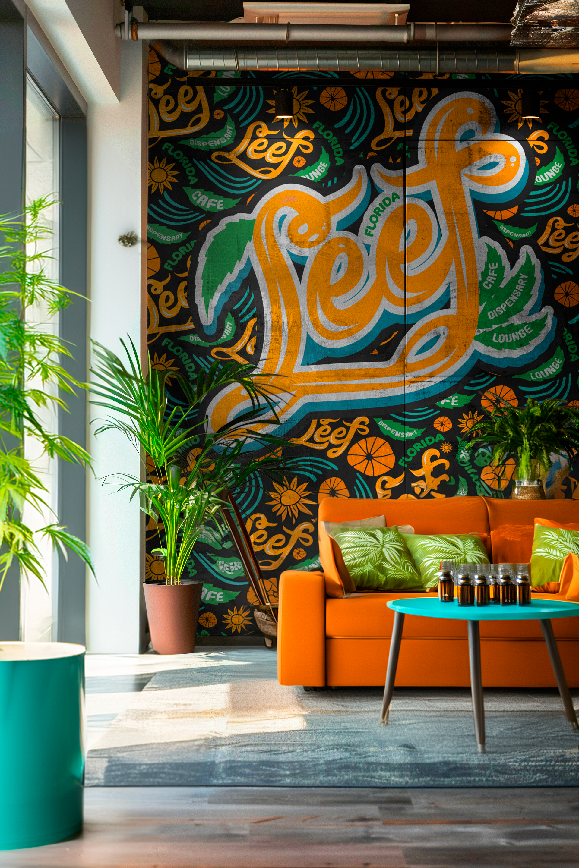 This mockup illustrates the LEEF logo's adaptability within a cozy lounge environment. The large-scale mural blends effortlessly with the vibrant decor, using bold typography and tropical-inspired accents to create a lively, welcoming space that reflects the café’s energetic and laid-back atmosphere.