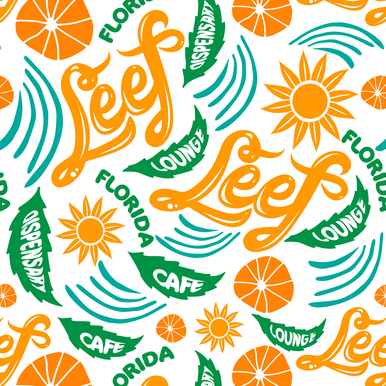 A repeating pattern that incorporates the LEEF logo with playful graphic elements like citrus slices, sunbursts, and wave motifs. This pattern was designed to add visual texture to packaging, wallpapers, or merchandise, reinforcing the brand’s lively, coastal aesthetic.
