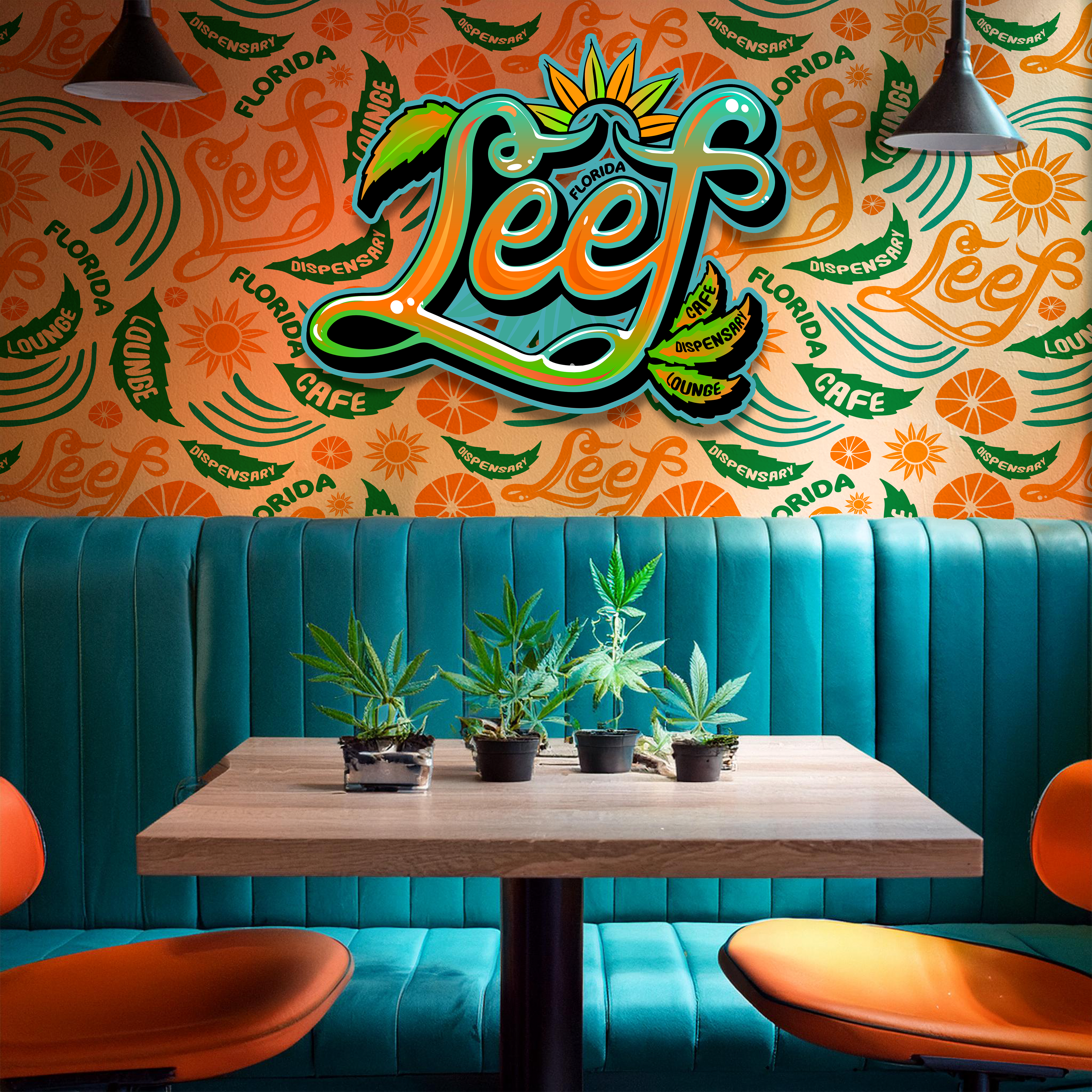 Branding concepts for LEEF, an Amsterdam-style cannabis café planned for Miami, Florida. This page showcases the custom logos I designed, reflecting a vibrant, tropical aesthetic that aligns with the café's laid-back vibe. The images feature concept mockups illustrating how the branding could be integrated into real-world spaces, highlighting the versatility and impact of the logo across various environments