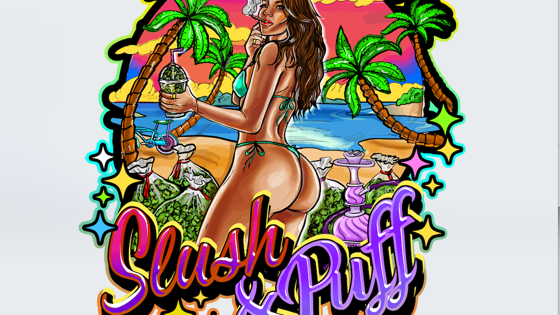 A dynamic, multi-colored version blending warm gradients with bold outlines to create a lively, eye-catching design. The tropical color palette, paired with organic shapes, captures the essence of Florida’s cannabis culture and café lifestyle.