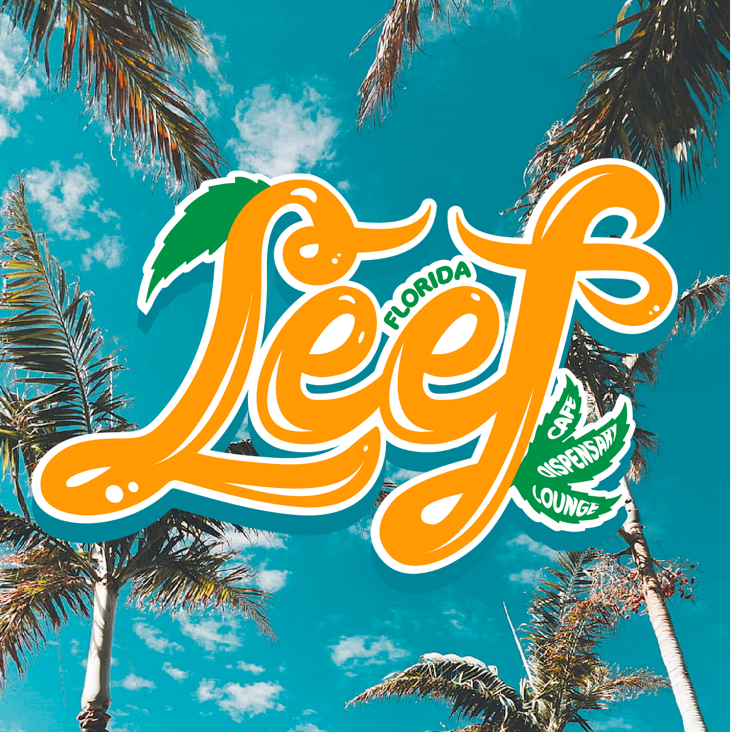 LEEF logo mockup against a bright Florida sky with palm trees, showcasing cannabis café branding in a tropical setting.